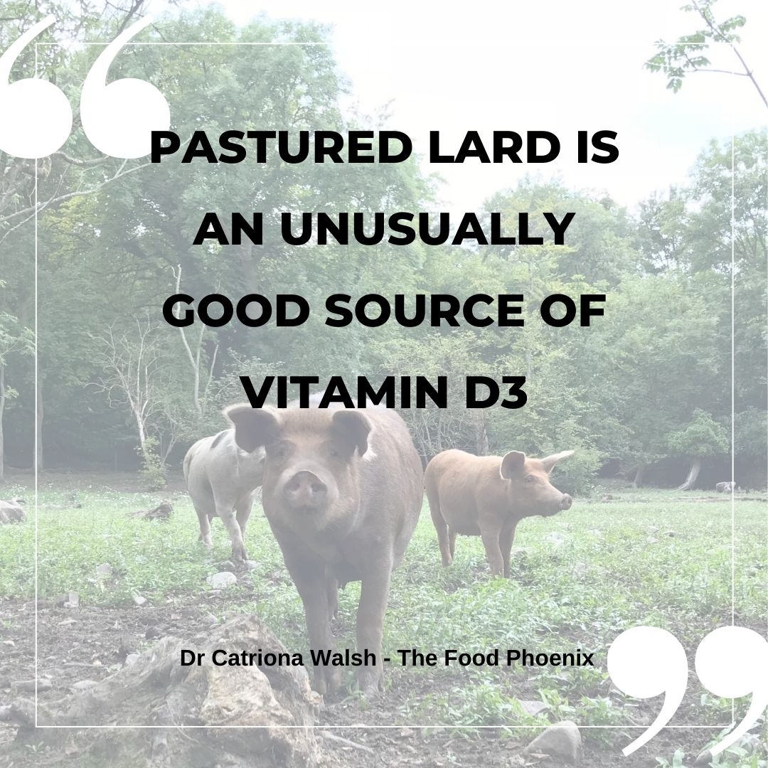 Pastured lard is an unusually good source of vitamin D3. We aren’t the only animals to make vitamin D in our skins when we’re outside in the sunshine and store it in our fat. Pigs are ninjas at it. Of course, pigs stuck indoors all day contain much less vitamin D. So knowing the source of your food is again crucial. And it’s yet another black mark against factory farming. Intensive CAFO-farmed pig fat contains very little vitamin D, as you’d expect. CAFO stands for concentrated animal feeding operation.